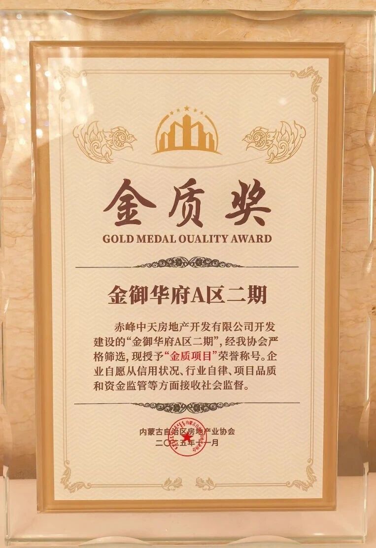 近日,内蒙古自治区房地产行业权威表彰榜单正式揭晓。赤峰中天房地产开发有限公司凭借卓越的开发硬实力、深厚的诚信底蕴与卓著的品牌口碑,一举摘得多项自治区级重磅荣誉—— 公司获评 “内蒙古自治区房地产开发诚信企业”“优秀会员单位”,旗下标杆项目中天・云境(金御华府A区二期)荣膺 “内蒙古自治区房地产开发金质奖”,福瑞一品项目荣膺内蒙古自治区广厦奖候选项目、曹磊总经理荣获 “优秀个人” 称号,王敏经理荣获“优秀项目管理人”称号。多项荣誉加身,既是行业对中天地产的高度认可,更是万千业主与社会各界的信赖见证。